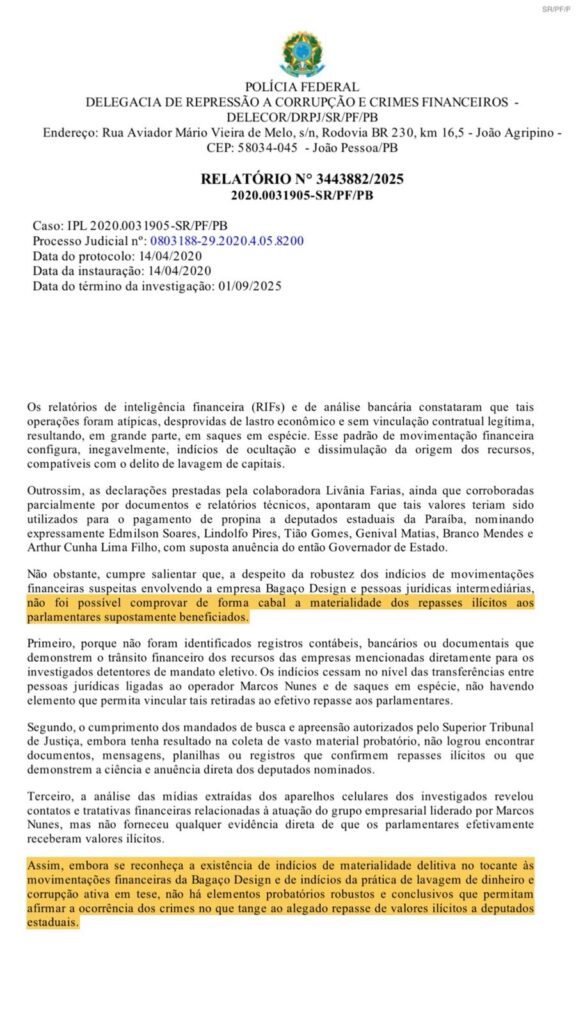 A Polícia Federal concluiu o inquérito nº 2020.0031905, instaurado a partir de delação premiada, e confirmou em relatório final que não há qualquer prova, indício ou movimentação financeira que comprove repasses ilícitos a deputados estaduais citados. O documento, assinado em 1º de setembro de 2025, foi categórico ao afirmar que a colaboração da delatora “não se mostrou corroborada por provas independentes suficientes para confirmar, de modo seguro, a materialidade e autoria das supostas condutas imputadas”.