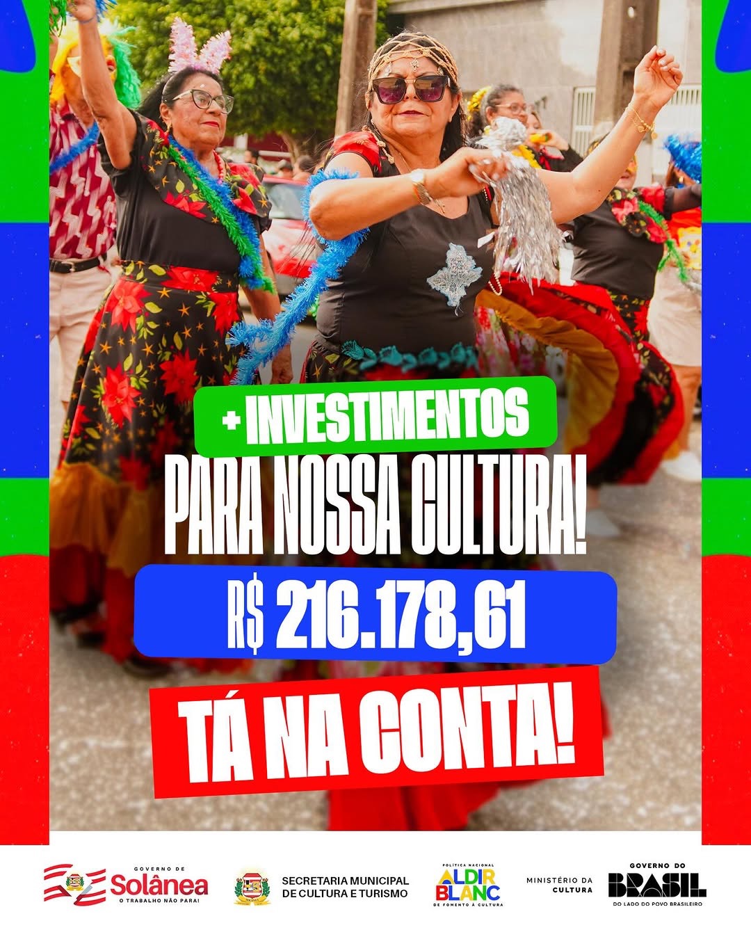 O Governo de Solânea, através da Secretaria de Cultura e Turismo, anunciou a chegada de novos recursos destinados ao fortalecimento das políticas públicas culturais no município. O valor de R$ 216.178,61 já está disponível em conta e será aplicado em ações culturais por meio do segundo ciclo da Política Nacional Aldir Blanc de Fomento à Cultura (PNAB).